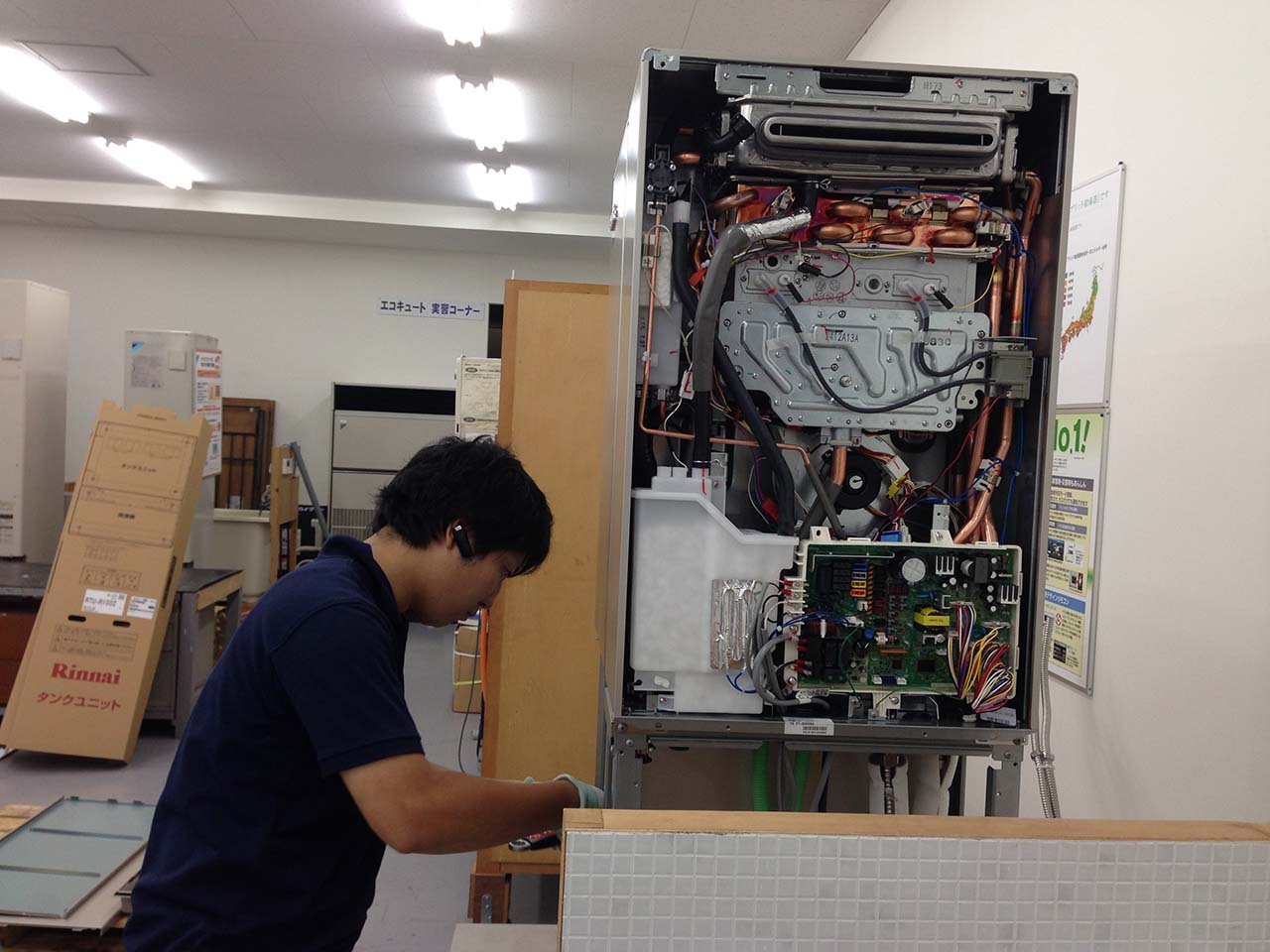 故障の時などにどのように対応し、エコジョーズへの取替提案を実施できるかを学びます。実際にガスを点火してリモコン操作などの試運転が実施できます。エコジョーズがいかに排熱を効率化してエネルギーに変えているかが分かります。