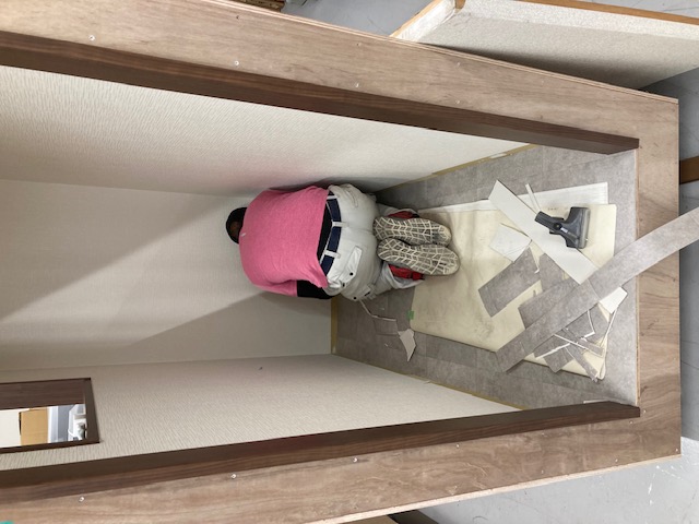 4.CF、フロアタイル施工学習(床材カット、ノリ付け、床材施工)